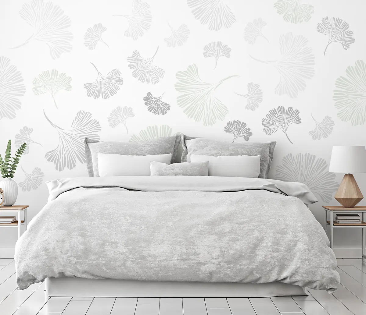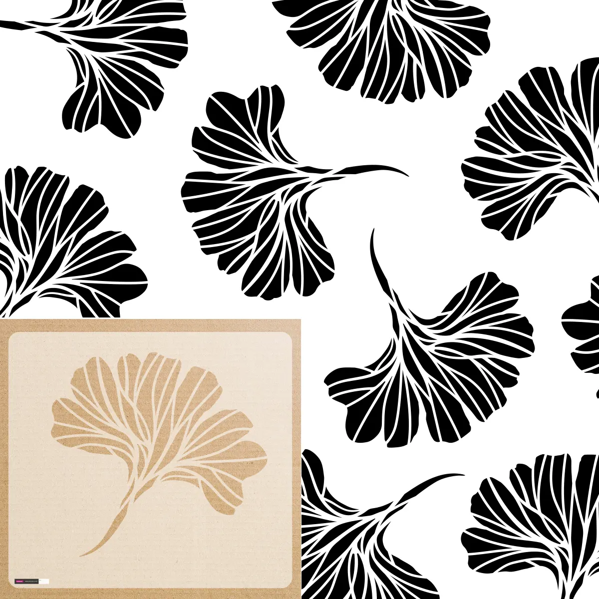 Szablon malarski – liść miłorzębu japońskiego (Ginkgo biloba) Prosty w odbijaniu wzór sprawi, że ściana będzie oszałamiający akcentem w każdym wnętrzu! Świetny do rustykalnych i nowoczesnych pomieszczeń, wystarczy wypróbować go w różnych kombinacjach kolorystycznych.